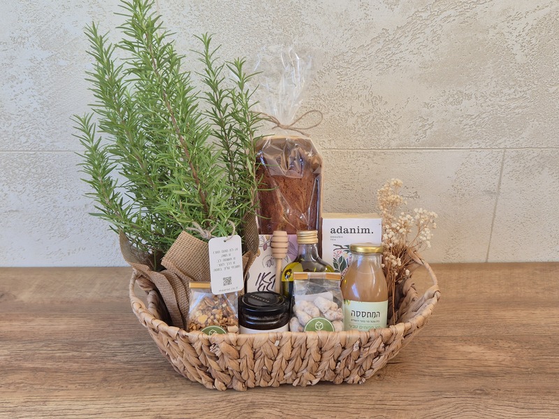 המארז נפתח בצנצנת דבש טהור ועוגת דבש רכה – סמל מתוק לתחילתה של שנה מבורכת. לצדם מצטרפת חליטת עדנים מפנקת ומיץ טבעי קטן – רגע של רוגע ושלווה בין כל האיחולים. כדי להוסיף נגיעה של אדמה מקומית, שילבנו בקבוק שמן זית מובחר, עציץ תבלין ירוק ורענן שימשיך ללוות גם אחרי החג, וכולם מוגשים בתוך סלסלה דקורטיבית המשמשת גם כפריט עיצובי לשולחן או למטבח. ואיך אפשר בלי מתוק אמיתי? 🍫במארז תמצאו טבלת שוקולד משובחת, לצד שקדים ואגוזים מצופים – טעמים עשירים שמוסיפים חגיגיות לכל ביס.