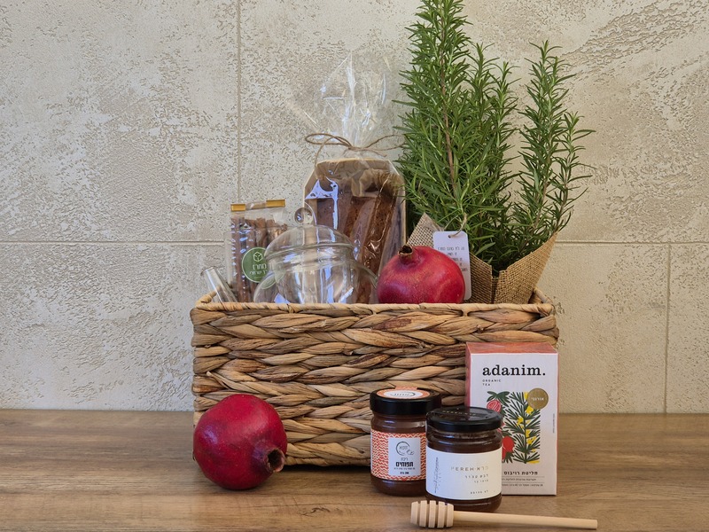במארז הזה לראש השנה ארזנו חגיגה קטנה של טעמים וריחות מהארץ שלנו. עציץ תבלין עונתי מוסיף ירוק ורעננות, דבש איכותי שדואג לפתוח את השנה מתוקה, וריבה גלילית מביאה ניחוח של בית וחג. עוגת דבש רכה מזמינה ביס מתוק וחמים, וחליטת רויבוס רימון עם מקלות קינמון הופכת כל כוס תה לרגע של שלווה. כל הטוב הזה מגיע עם קנקן תה וזוג כוסות, ונארז בסלסלת קש חגיגית שמכניסה צבע ושמחה כבר לפני שטועמים.