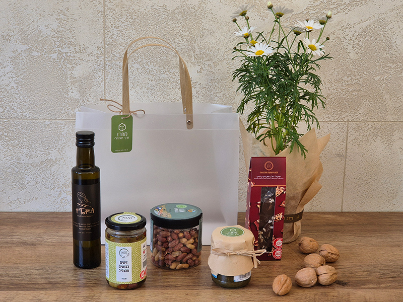 מארז "פסח גלילי" משלב חומרי גלם איכותיים עם אופי מקומי ברור: שמן זית כתית מעולה וזיתים כבושים מהגליל נפגשים עם חרוסת עשירה ונשנושי שוקולד מפנקים. הצמח העונתי מוסיף נוכחות ירוקה שמכניסה את תחושת האביב אל תוך הבית והאירוח.